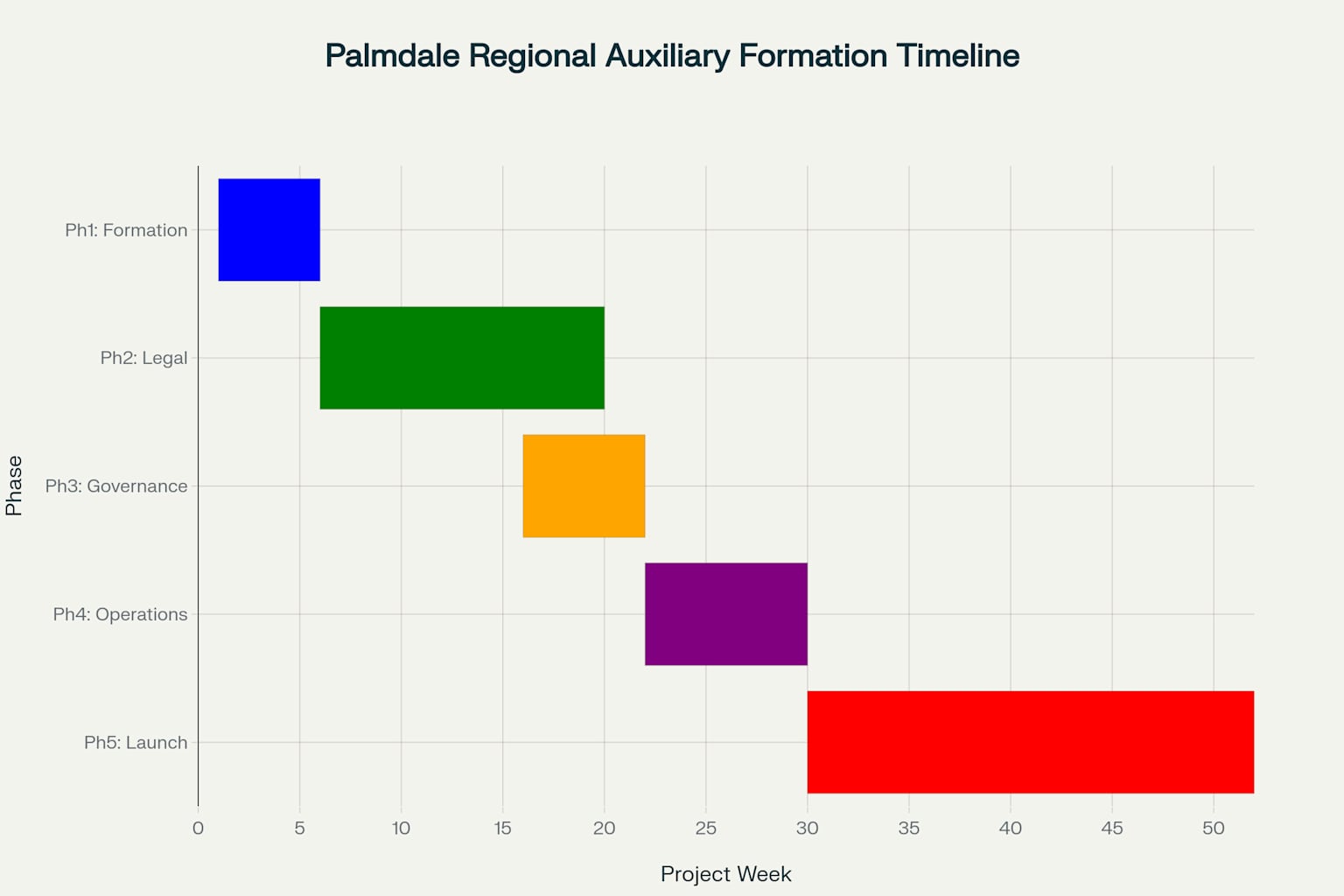 | Total Project | 56 weeks | $43,260 | 100% | Complete auxiliary formation |